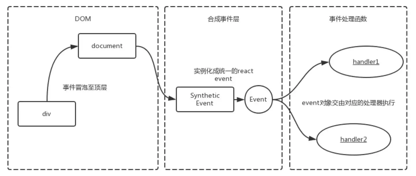 React并不是将click事件绑在该 div 的真实DOM上,而是在document处监听所有支持的事件,当事件发生并冒泡至document处时,React将事件内容封装并交由真正的处理函数运行。 其中,由于event对象是复用的,事件处理函数执行完后,属性会被清空,所以event的属性无法被异步访问,详情请查阅event-pooling